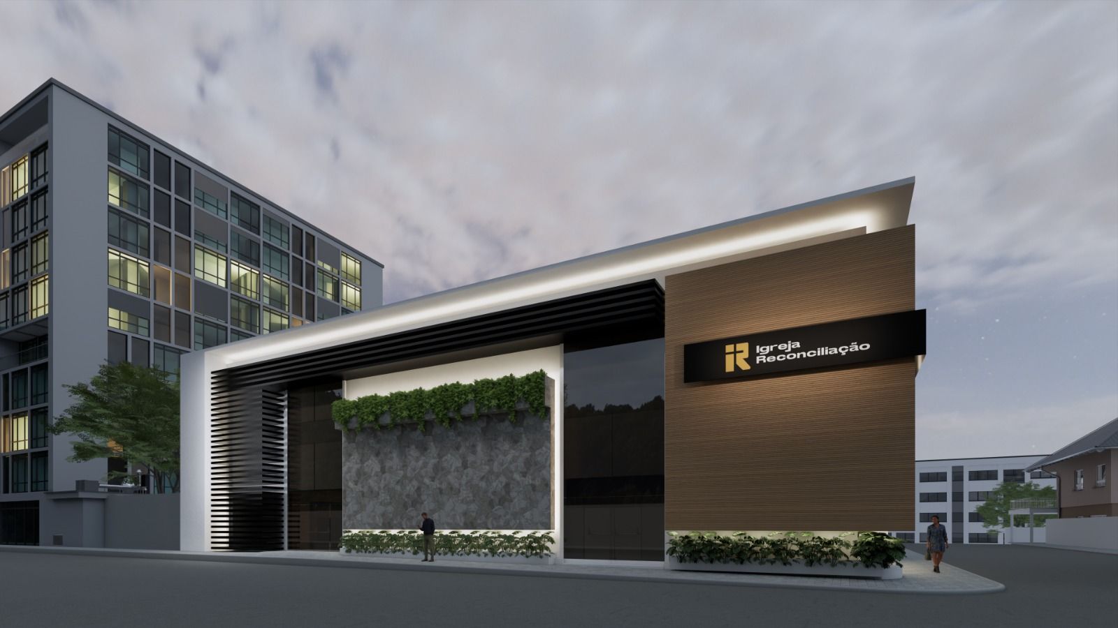 Apresentamos mais um projeto de Arquitetura Religiosa Evangélica Contemporânea: projeto para a revitalização da fachada e do interior da Igreja Evangélica Reconciliação. O projeto da fachada traduz a modernidade do nosso traço arquitetônico. O design é marcado pelo contraste elegante entre materiais nobres, cores e texturas, conferindo à Igreja uma identidade visual impactante e acolhedora, perfeitamente alinhada com os templos evangélicos do século XXI.