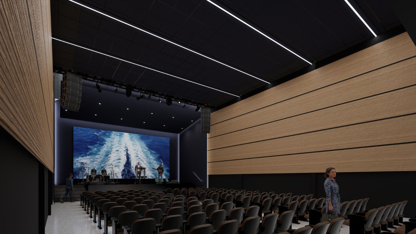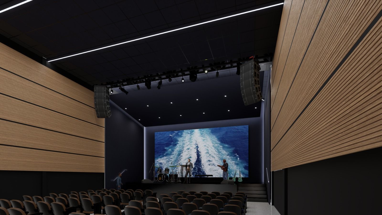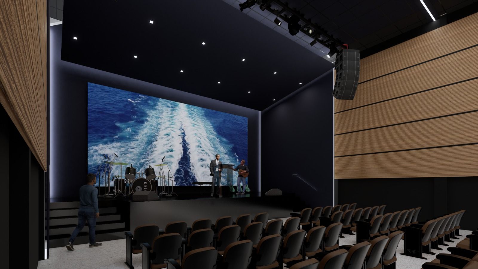 O cuidado com o espaço religioso se estende ao ambiente interno. A plateia-nave e o palco-púlpito foram desenhados com foco máximo em conforto acústico e luminoso. Utilizamos soluções técnicas que garantem a acústica ideal para a clareza da mensagem e a vibração do louvor. O projeto luminotécnico cria uma atmosfera serena e inspiradora, maximizando a experiência de culto e adoração.